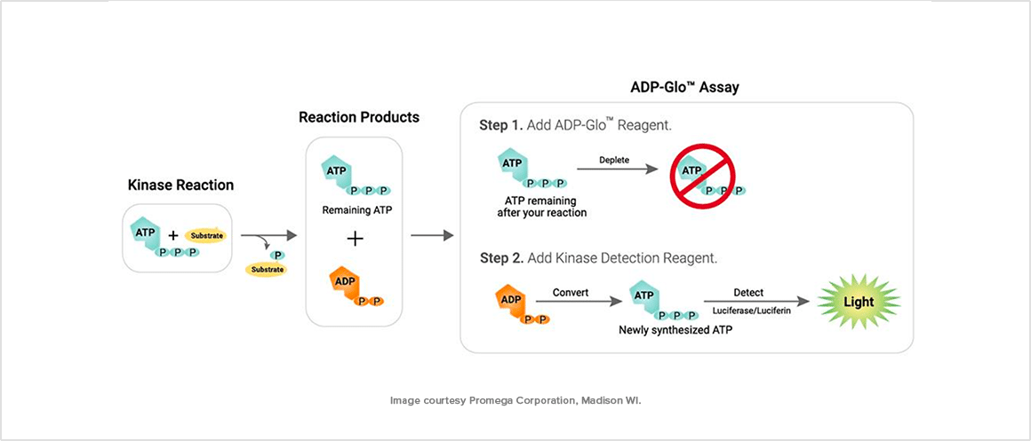 Finally, the Kinase Detection Reagent converts ADP back to ATP, which is quantified through a luminescent signal.