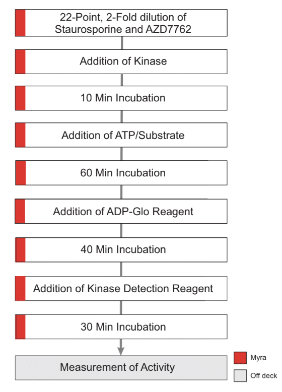 Accurate measurement of kinase activity depends on the addition of reagents, substrates, and inhibitors at specific concentrations, volumes, and times. The Myra liquid handling system has been shown to provide unmatched precision in liquid dispensing, reduced manual intervention, and minimized human errors, revolutionizing the conduct of kinase assays.